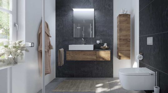Die Kombination aus Badkeramik, Möbeln und Armaturen überzeugt durch Qualität und durchdachte Funktion. So entsteht ein Raum, der das tägliche Ritual des Badens in ein Erlebnis der Entspannung verwandelt.
